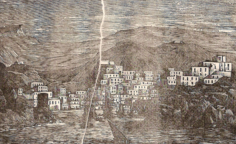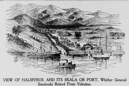 Ο Αλμυρός το 1886 (διακρίνεται ο Τούρκικος στρατώνας και δεξιά η πρώτη χριστιανική εκκλησία του Αγ. Νικολάου έξω από την τότε πόλη)
