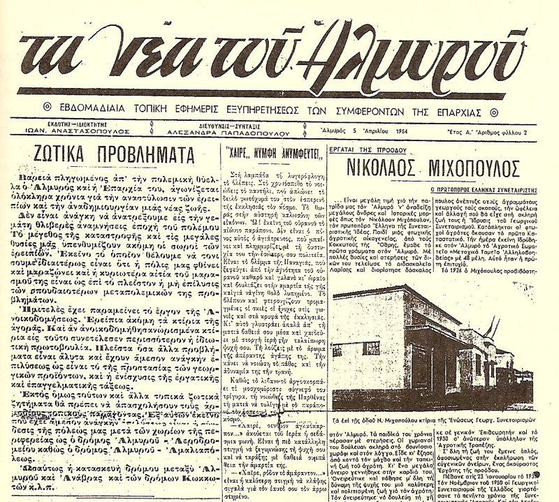Το 1954 παρουσιάστηκαν σχεδόν ταυτόχρονα δύο τοπικές εφημερίδες, «Τα Νέα του Αλμυρού» και «Η Εφημερίς του Αλμυρού» με εκδότες τους Γιάννη Αναστασόπουλο και Γεώργιο Κολλήγα αντίστοιχα. Γρήγορα όμως οι δύο εφημερίδες συνενώθηκαν σε μία «την μεν μία εβδομάδαν υπό τον τίτλον ¨Εφημερίς του Αλμυρού», την δε ετέραν υπό τον τίτλον ¨Τα Νέα του Αλμυρού¨». Κι αυτή η προσπάθεια όμως δεν κράτησε μεγάλο χρονικό διάστημα. Το 1976 η «Η Εφημερίς του Αλμυρού» εκδόθηκε και πάλι αλλά για πολύ λίγο.